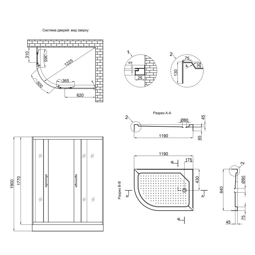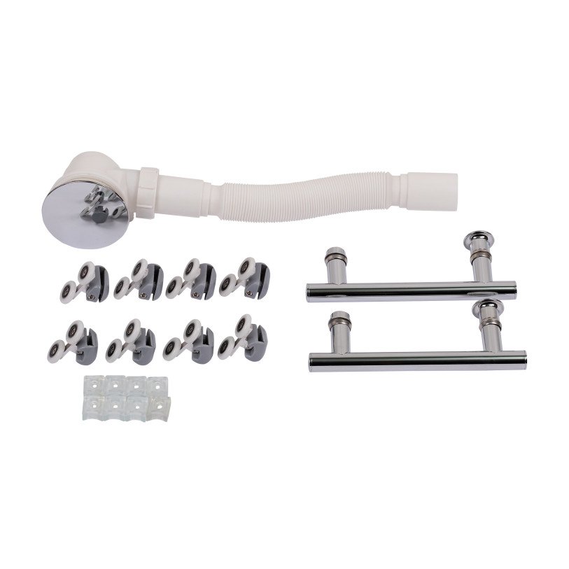 | Комплектація | Піддон, сифон, подвійні ролики, ручки, комплект кріпильних деталей, глухе скло, скляні двері, перехідник 32/50 мм, профіль. |