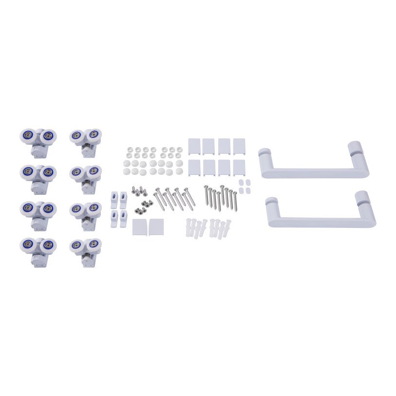 | Комплектація | Подвійні ролики, ручки, верхній профіль, нижній профіль, бічні профілі, набір ущільнювачів, розширювальні профілі, 2 скляні двері, 2 глухих скла, комплект кріпильних деталей, заглушки, з‘єднувальні елементи, фіксатори. |