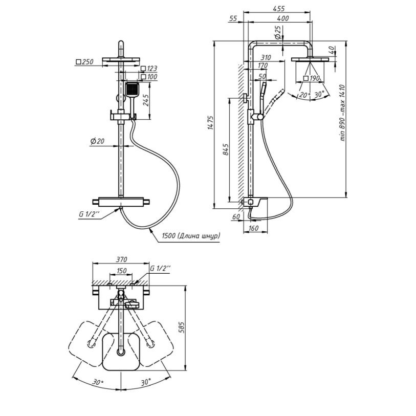 | Висота душової стійки, мм | 890-1470 |