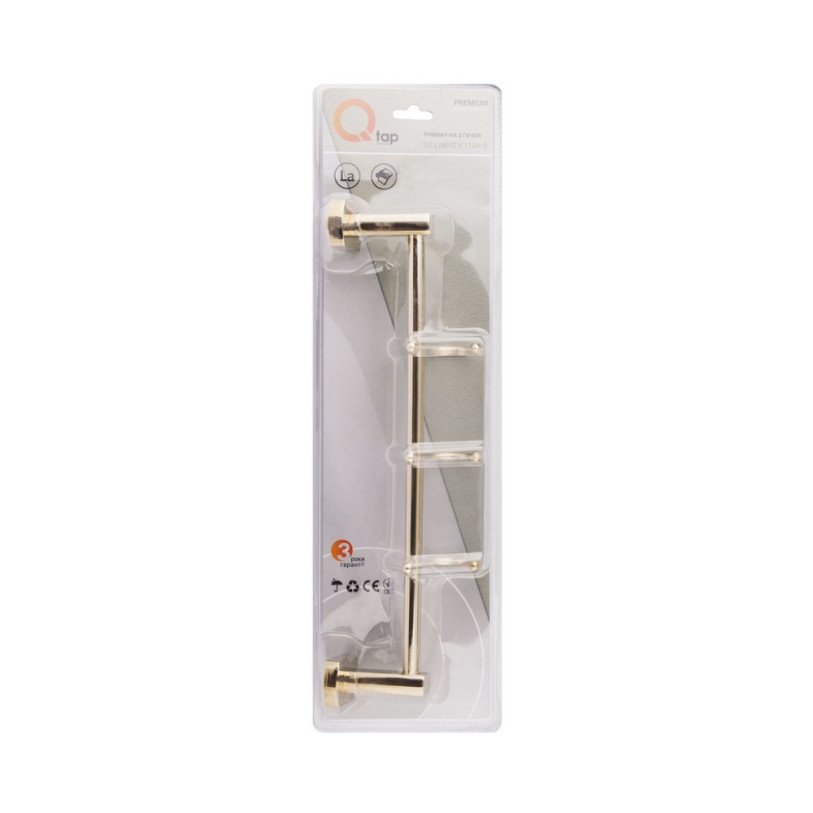 Універсальний тримач для рушників і халатів Qtap Liberty ORO 1154-3 виконаний у вигляді стрижня з трьома гачками. Він кріпиться на стіні на зручній висоті до вставок за допомогою монтажних елементів, які входять до комплекту. На вставки нанесено фірмовий логотип виробника. Прихований монтаж дозволяє зберегти обробку ванної кімнати. Під час прибирання досить протерти за допомогою мильного розчину та м‘якої серветки.