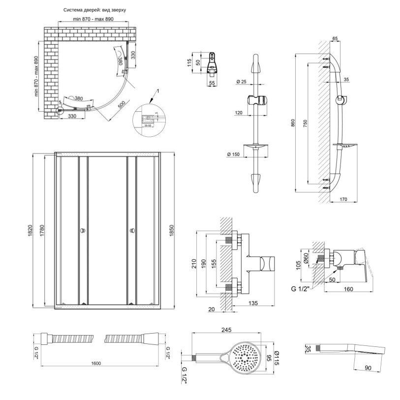 | Комплектація | Подвійні ролики, ручки, верхній профіль, нижній профіль, бічні профілі, набір ущільнювачів, розширювальні профілі, 2 скляні двері, 2 глухі скла, комплект кріплень, заглушки, елементи, що з‘єднують, фіксатори. Змішувач, захист гайок від подряпин, кріплення. Штанга для душу, кронштейн для ручного душу, мильниця, кріплення. Душовий шланг. Лійка для ручного душу, зворотний клапан. |