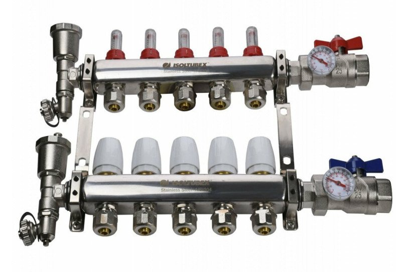 Матеріал колектора нержавіюча сталь, арматури і фітингів - латунь CW617N, ущільнювачами та золотникових прокладок - EPDM. У комплект входять кріплення.