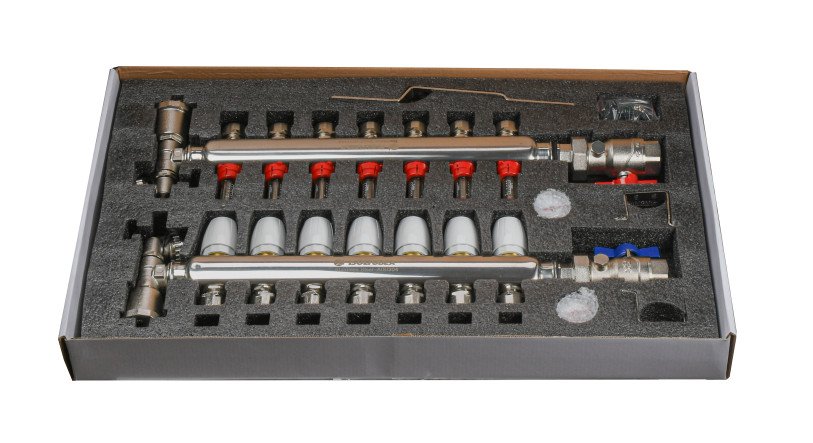 Матеріал колектора нержавіюча сталь, арматури і фітингів - латунь CW617N, ущільнювачами та золотникових прокладок - EPDM. У комплект входять кріплення.