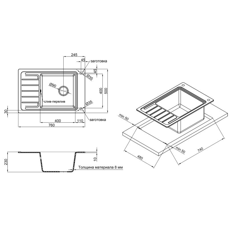 | Комплектація | Мийка, сифон, зливник/перелив, кошиковий вентиль, кріпильні деталі. |