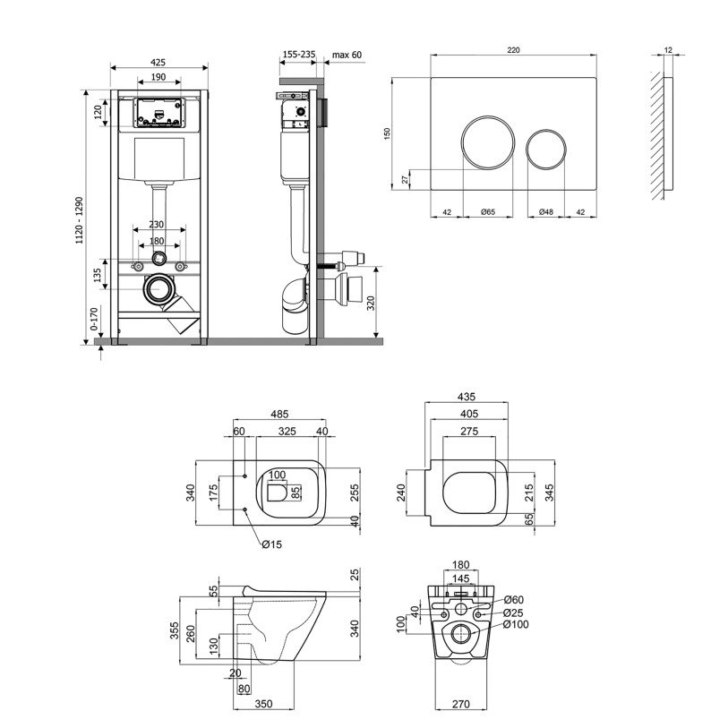 | Габаритні розміри виробу (ВхШхГ), мм | Інсталяція: 1280х425х185. Панель змиву: 150х220х30. Унітаз: 355х340х485. Сидіння для унітаза: 55х345х435 |