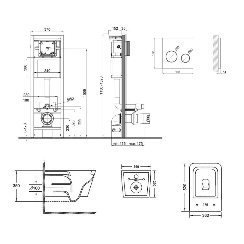 | Габаритні розміри виробу (ВхШхГ), мм | Інсталяція: 1320х370х175. Панель змиву: 190х190х32. Унітаз: 350х360х520. Сидіння для унітаза: 50х350х445 |