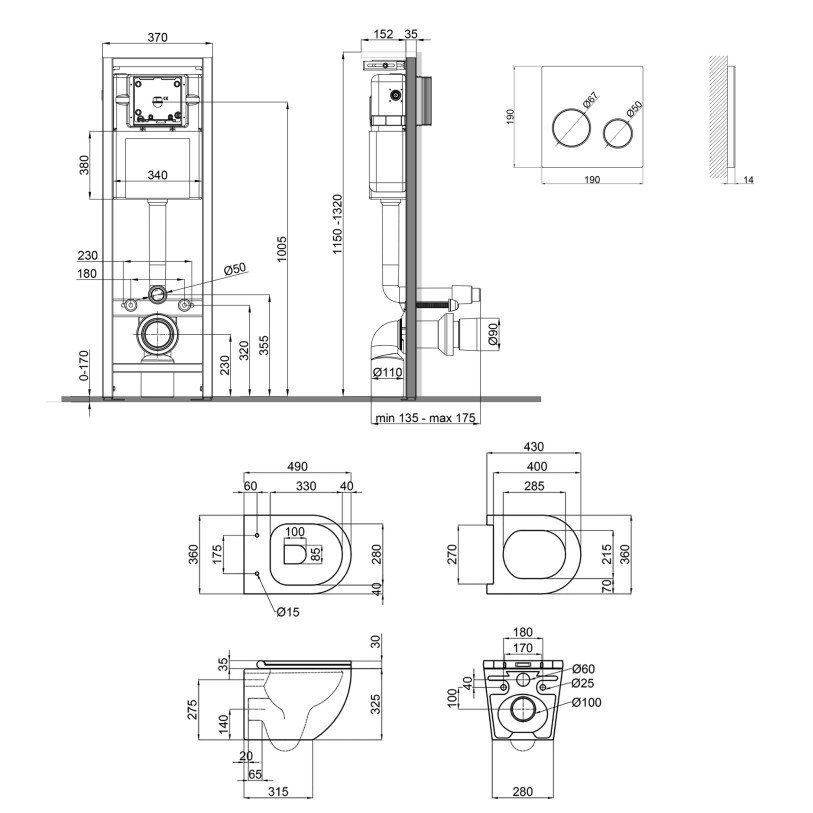 | Габаритні розміри виробу (ВхШхГ), мм | Інсталяція: 1320х370х175. Панель змиву: 190х190х32. Унітаз: 375х360х490. Сидіння для унітаза: 50х365х440 |