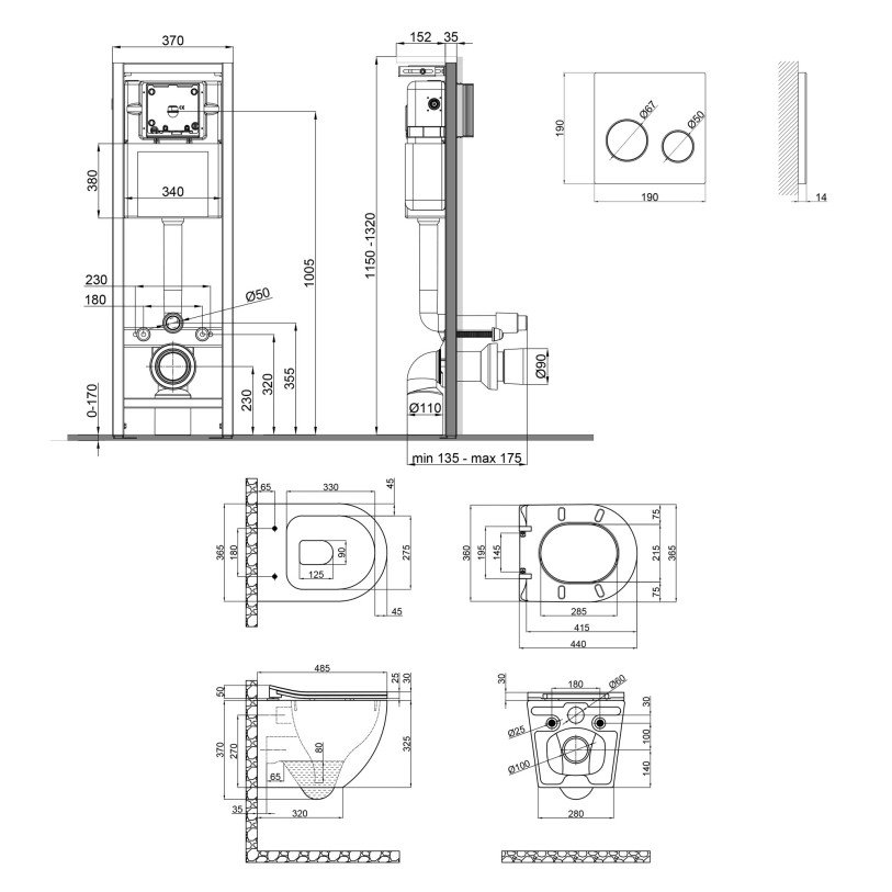 | Габаритні розміри виробу (ВхШхГ), мм | Інсталяція: 1320х370х175. Панель змиву: 190х190х32. Унітаз: 370х365х485. Сидіння для унітаза: 50х365х440 |