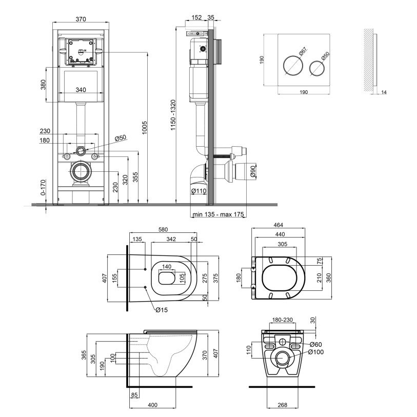 | Габаритні розміри виробу (ВхШхГ), мм | Інсталяція: 1320х370х175. Панель змиву: 190х190х32. Унітаз: 370х407х580. Сидіння для унітаза: 30х360х464 |