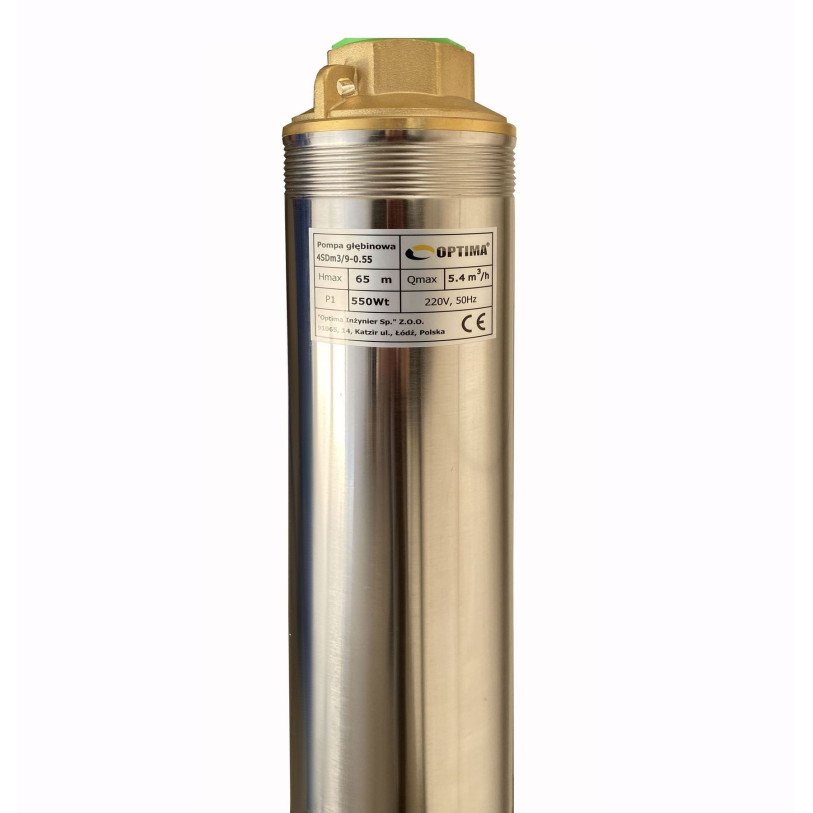 НасосOPTIMA 4SDm3 / 9 0.55 кВт 65м складається з двох частин: двигун в нижній частині і насос у верхній частині, жорстко зєднані між собою зубчастої муфтою міжнародного стандарту Nema і має забір води в середній частині корпусу. Насос относятітся до насосів відцентрового типу і має багатоступеневу конструкцію і «плаваючі» робочі колеса, завдяки яким реалізується підвищена стійкість до піску (до 2000 г / м3).