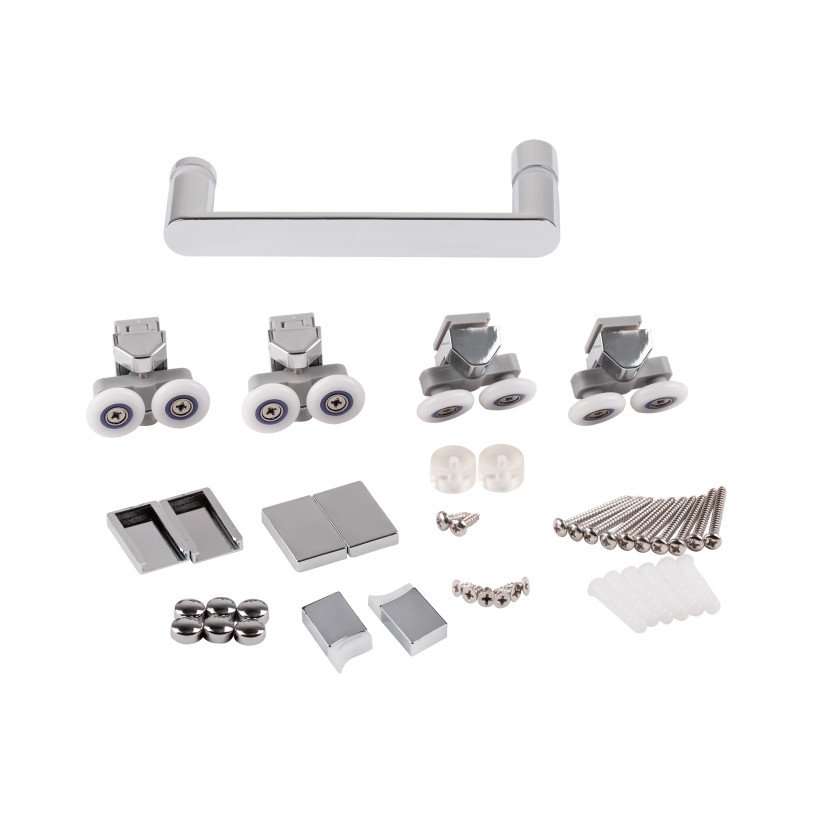 | Комплектация | Глухое стекло, стеклянная дверь, расширительные профили, верхний профиль, нижний профиль, ручка, двойные ролики, комплект крепежей, набор уплотнителей, заглушки. |