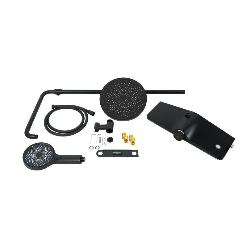 | Комплектация | Змішувач, кронштейн для верхнього душу, лійка для верхнього душу, кронштейн для ручного душу, лійка для ручного душу, душовий шланг, душова стійка, кріпильні деталі. |