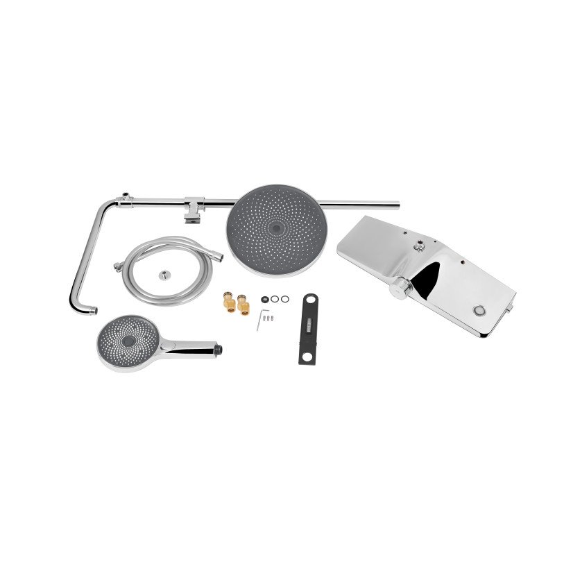 | Комплектация | Змішувач, кронштейн для верхнього душу, лійка для верхнього душу, кронштейн для ручного душу, лійка для ручного душу, душовий шланг, душова стійка, кріпильні деталі. |
