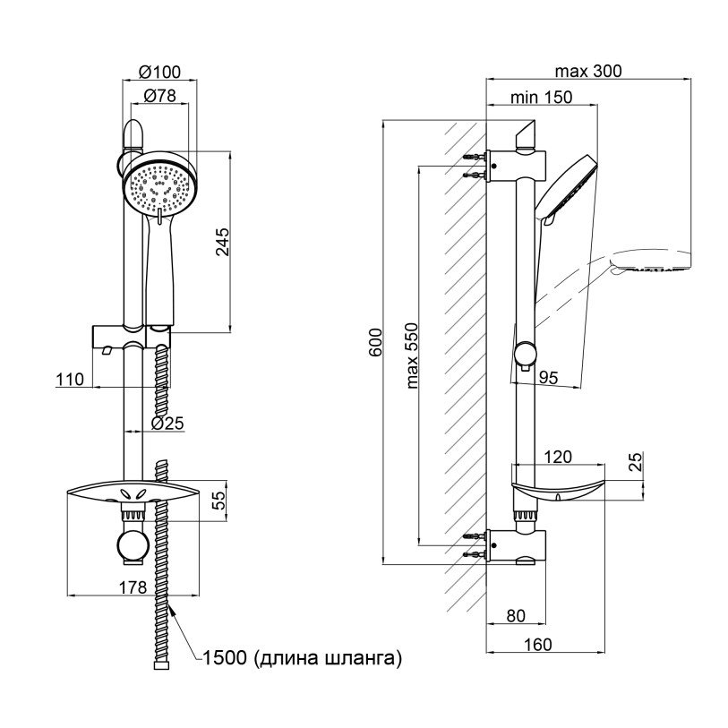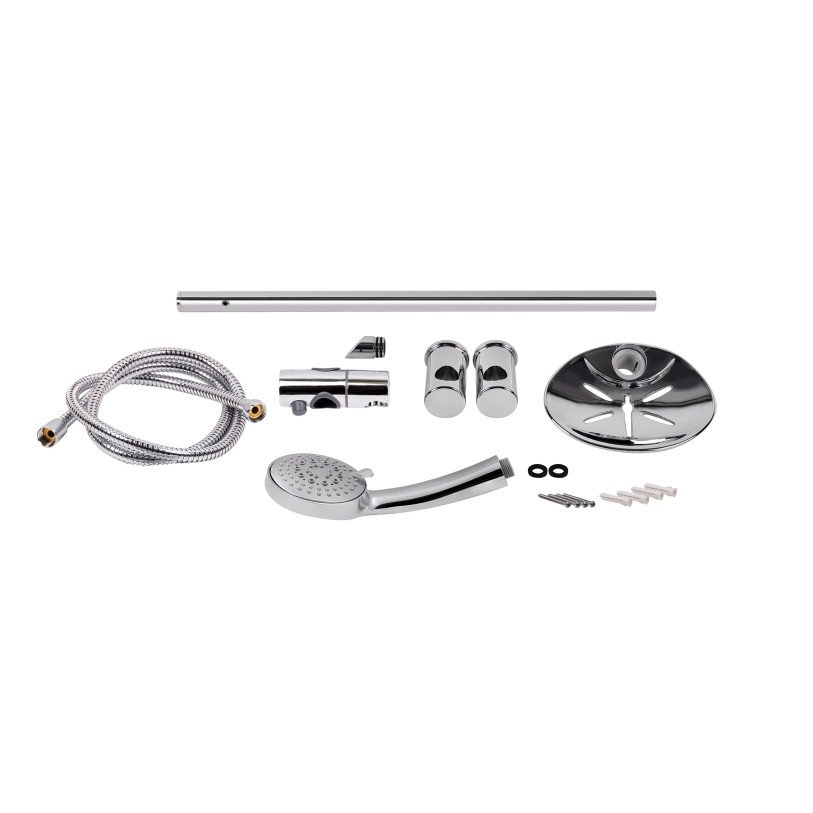 | Комплектация | Душевая стойка, мыльница, кронштейн для ручного душа, лейка для ручного душа, душевой шланг, крепежи. |