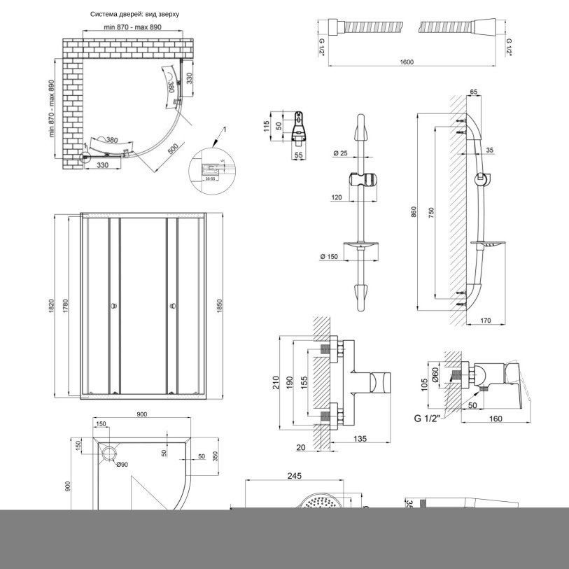 | Комплектация | Подвійні ролики, ручки, верхній профіль, нижній профіль, бічні профілі, набір ущільнювачів, розширювальні профілі, 2 скляні двері, 2 глухі скла, комплект кріплень, заглушки, елементи, що з‘єднують, фіксатори. Піддон, ніжки, сифон із гідрозатвором. Змішувач, захист гайок від подряпин, кріплення. Штанга для душу, кронштейн для ручного душу, мильниця, кріплення. Душовий шланг. Лійка для ручного душу, зворотний клапан |