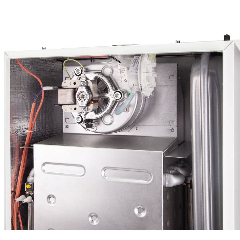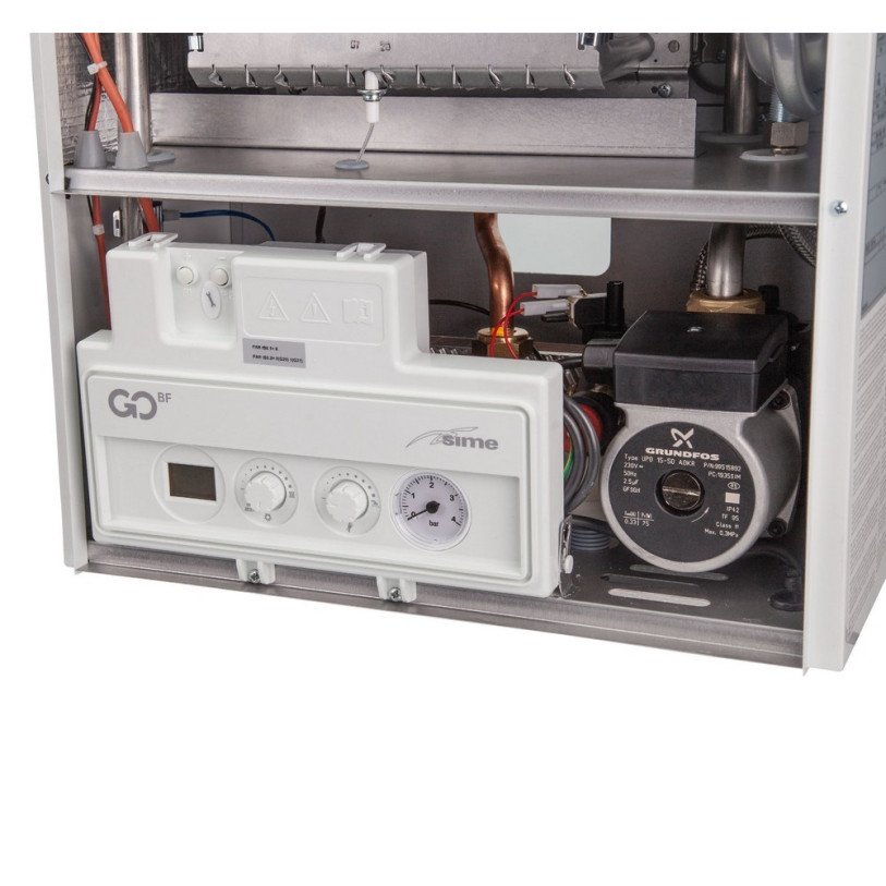 Функцию нагрева теплоносителя для отопительной системы и горячего водоснабжения выполнит котел газовый Sime GO 30 BF 18 кВт двухконтурный. Некоторые конструктивные особенности устройства: закрытая камера сгорания, два теплообменника, компактные размеры, управление ГВС при помощи двойного датчика, защита от замерзания, возможность подключения сенсора температуры наружного воздуха (опция), панель управления с дисплеем. Для обслуживания изделие обеспечена простота доступа ко всем компонентам.