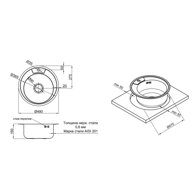 Кухонная мойка Lidz 490-A 0,6 мм Satin (LIDZ490A06SAT160)