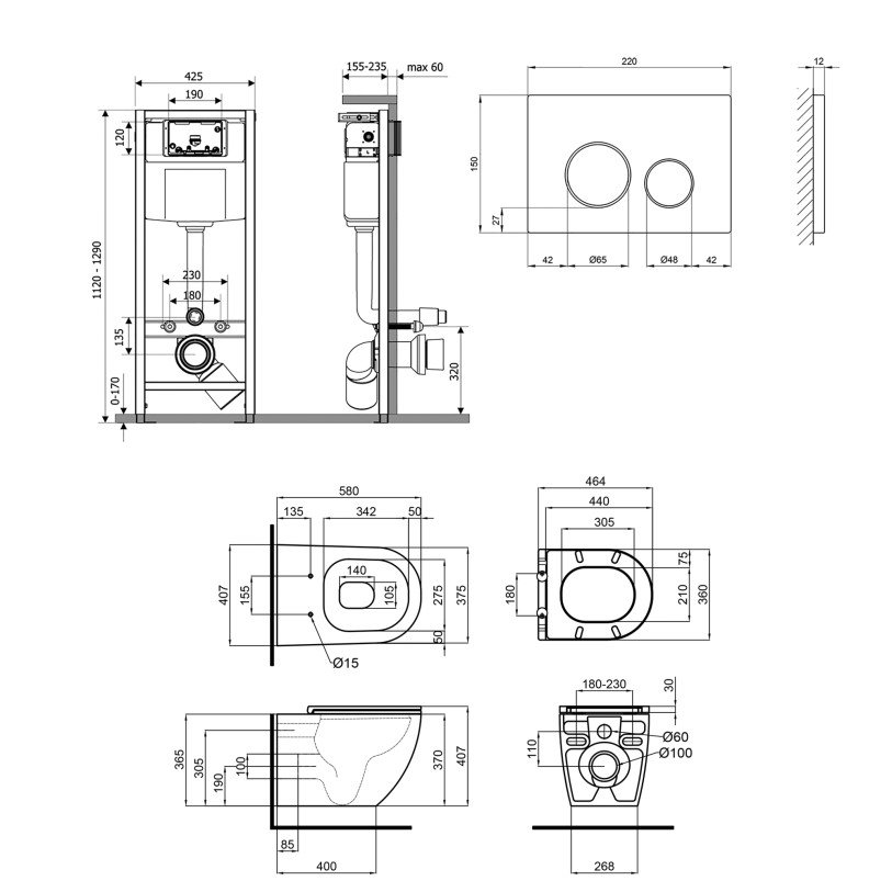 | Габаритные размеры изделия (ВхШхГ), мм | Інсталяція: 1280х425х185. Панель змиву: 150х220х30. Унітаз: 370х407х580. Сидіння для унітаза: 50х365х440 |