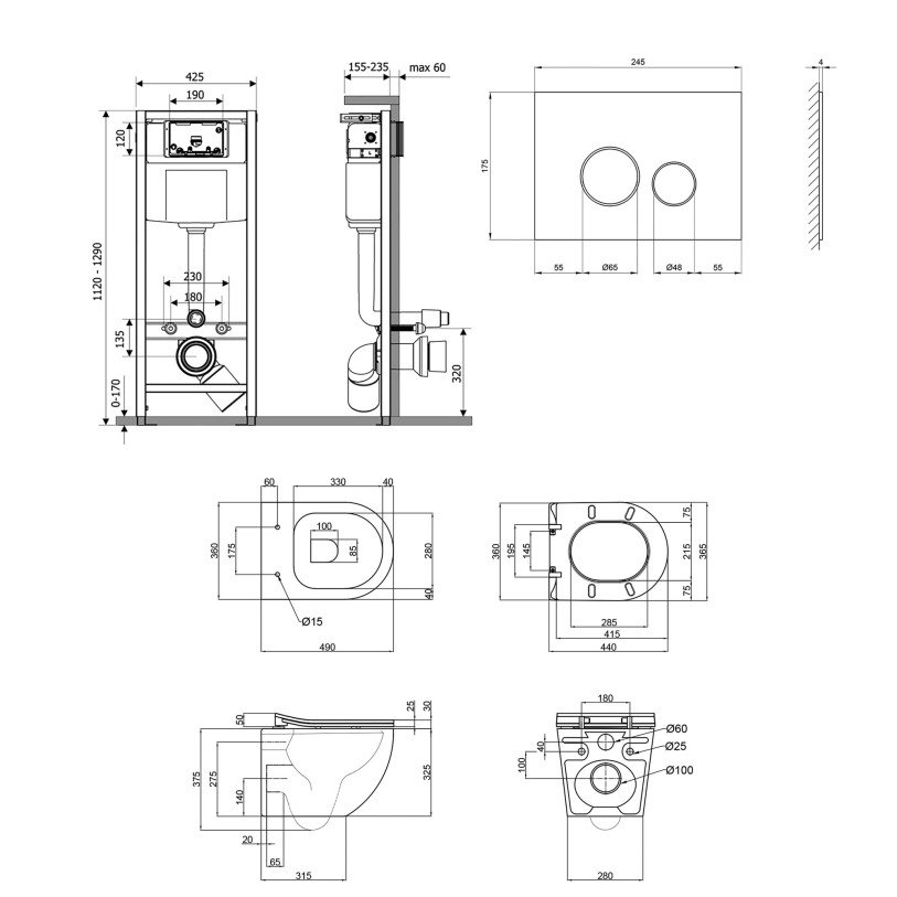 | Габаритные размеры изделия (ВхШхГ), мм | Інсталяція: 1280х425х185. Панель змиву: 175х245х30. Унітаз: 375х360х490. Сидіння для унітаза: 50х365х440 |