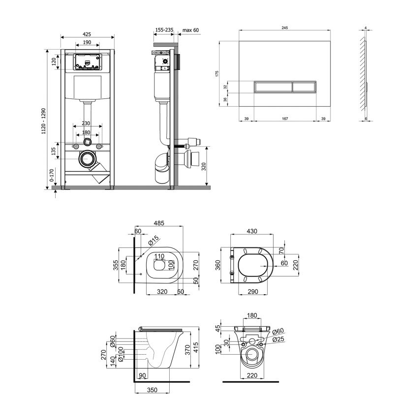 | Габаритные размеры изделия (ВхШхГ), мм | Інсталяція: 1280х425х185. Панель змиву: 175х245х32. Унітаз: 370х355х485. Сидіння для унітаза: 45х360х430 |