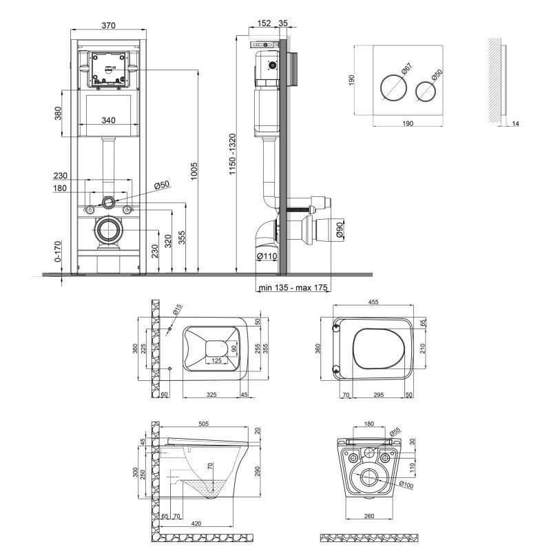 | Габаритные размеры изделия (ВхШхГ), мм | Інсталяція: 1320х370х175. Панель змиву: 190х190х32. Унитаз: 345х360х505. Сиденье для унитаза: 45х360х455 |