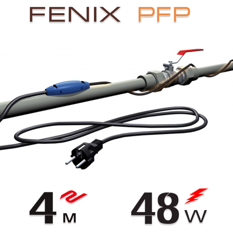 Двухжильный нагревательный кабель Fenix PFP имеет присоединенный провод питания длиной 1,5 м и вилку для подключения в розетку с контактом заземления. На конце кабеля предусмотрен биметаллический термостат, регулирующий режим обогрева трубопровода. Включение обогрева происходит при температуре трубы 3°C, а после нагрева до 10°C питание кабеля отключается, пока труба не остынет до нижнего предела.
