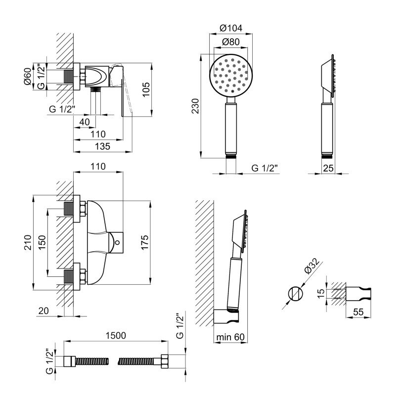 | Комплектация | Смеситель, кронштейн для ручного душа, лейка для ручного душа, душевой шланг, крепежи. |