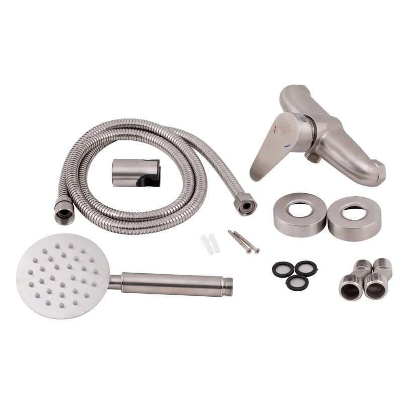 Смеситель для душа Lidz (NKS) 09 35 010 выполнен из нержавеющей стали с брашированной поверхностью. Смеситель монтируется на стену, а благодаря декоративным розеткам можно скрыть погрешности установки на отделке ванной комнаты. Подача воды и регулировка температуры осуществляется благодаря повороту рычага в нужное положение. В комплектацию входит душевой гарнитур.