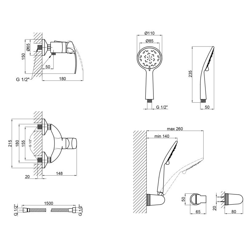 | Комплектация | Смеситель, лейка для ручного душа, душевой шланг, кронштейн, крепежи. |