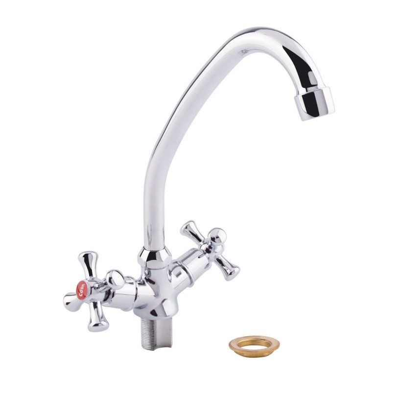 Смеситель для кухни GF (CRM)S-21-271AF изготовлен из силумина. Благодаря глянцевому хромированному покрытию имеет оригинальный внешний вид. Выполнен в классическом стиле, с вентильными ручками для переключения потока холодной и горячей воды.