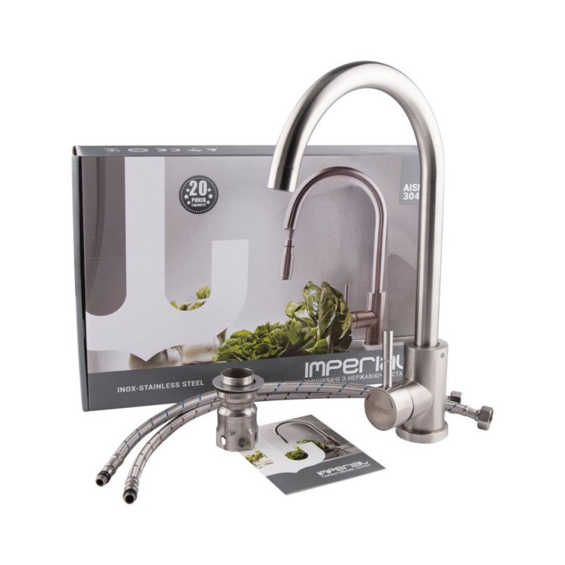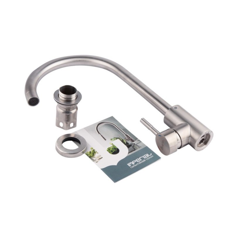 Смеситель для кухни Imperial 31-107-01 изготовлен из нержавеющей стали. Благодаря никелированной брашированной поверхности имеет оригинальный внешний вид. Выполнен в современном сдержанном стиле. Такой смеситель не только удобен и практичен, но и идеально дополнит интерьер кухни. После вытачивания изделия не проходят дополнительную шлифовку, незначительные царапины считаются нормой и не являются браком.