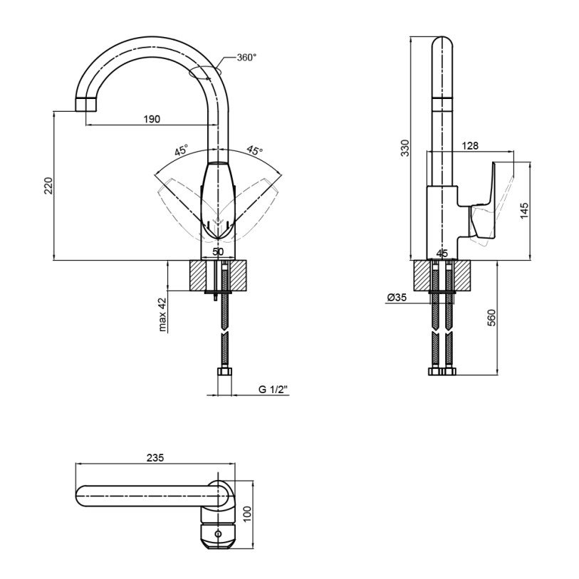 | Высота излива, мм | 220 |