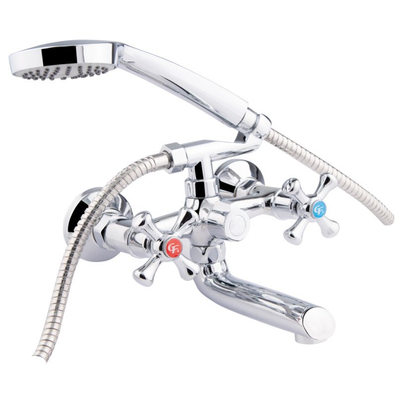 Смеситель для ванны GF (CRM)/S-21-1402 с коротким изливом выполнен с интегрированным шланговым подсоединением, укомплектован душевым шлангом и лейкой. Для включения потока воды предусмотрено два вентиля с нанесенными маркировкой Х+Г воды и фирменными логотипами производителя. Для переключения на душ - поворотный дивертор. Настенный монтаж осуществляется с помощью крепежных деталей, которые входят в комплект. Круглые розетки скроют следы установки на отделке.