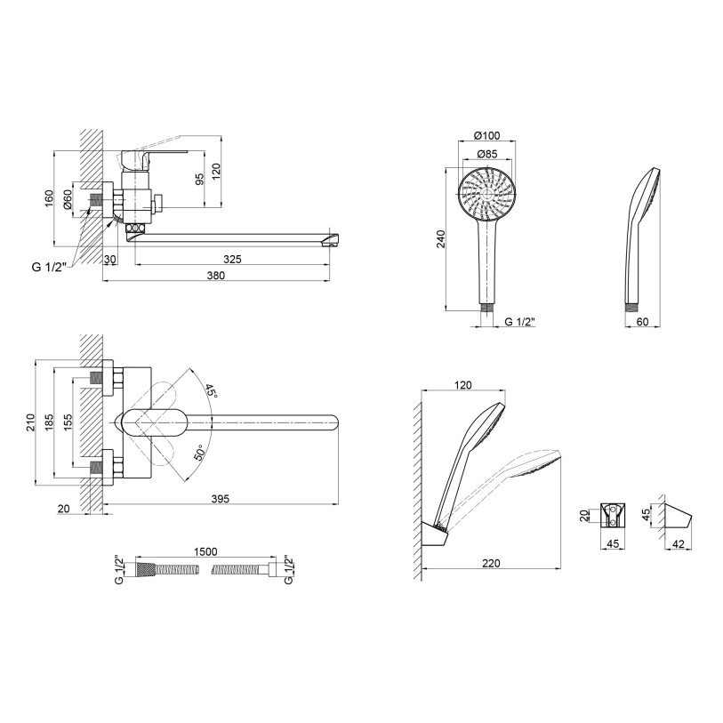 | Комплектация | Смеситель, лейка для ручного душа, душевой шланг, кронштейн для ручного душа, крепежи. |
