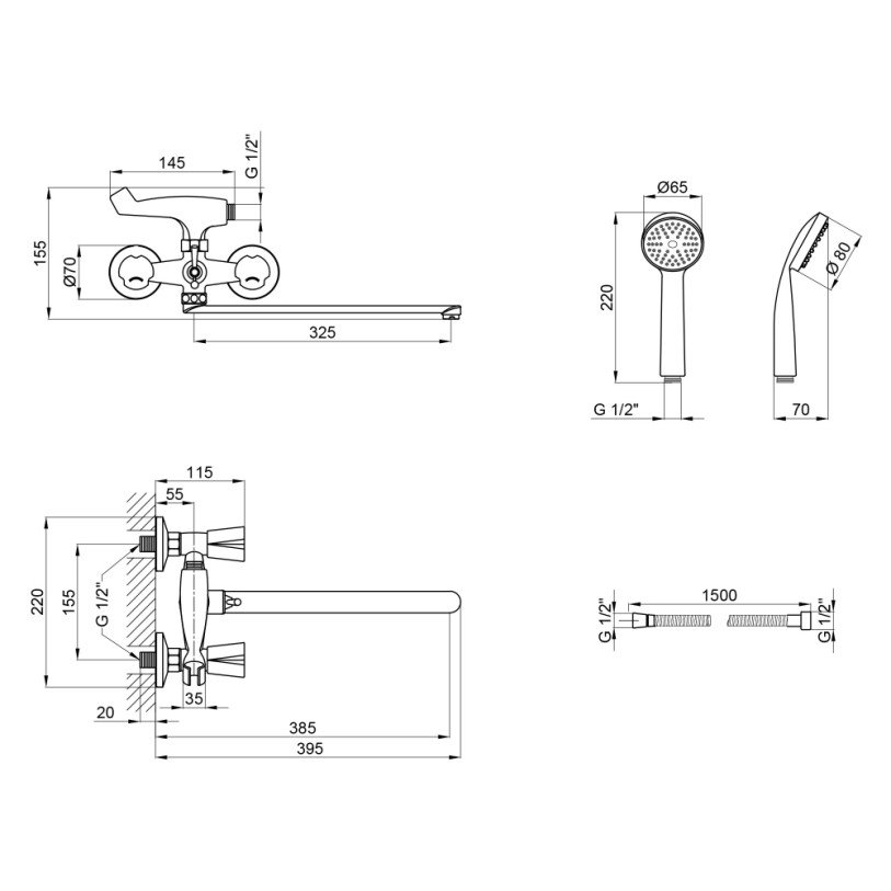 | Комплектация | Смеситель, лейка для ручного душа, душевой шланг, крепежи. |