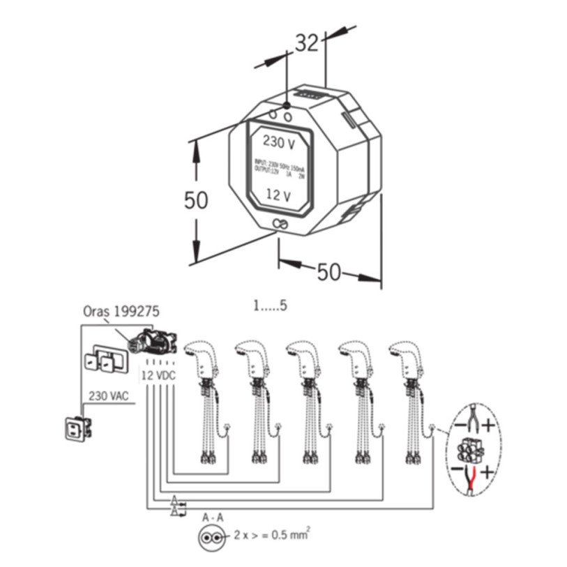 Трансформатор Oras Electra 199275 сконструирован для применения с изделиями Oras Electra (12 В). Его устанавливают в электромонтажную коробку 70 мм, оснащенную крышкой. Установка источника питания должна производиться только квалифицированным электриком.