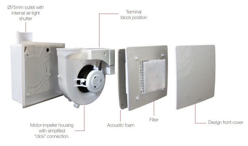 Ступінь захисту IPX4. Естетична передня плоска кришка для сучасного дизайн інтер'єру легко знімається для ослужіванія. Універсальний вихід діаметром 75 мм, який можна розташувати вгорі, внизу, свправа або свлево. Додатковий боковий вхід Ø50 мм (в комплекті в стандартній комплектації) для вторинної витяжки з сусідніх кімнат. Внутрішній фільтр для захисту крильчатки і мотора. Має зворотний клапан.Встроенная звукоізоляційна піна для акустичного комфорту. Повністю перероблені пластикові компоненти, екологічно чисті. Протестовано за останніми стандартами: пристрої протестовано в TÜV Rheinland, що означає точна, актуальна інформація про електробезпеки, продуктивності і рівнем шуму.