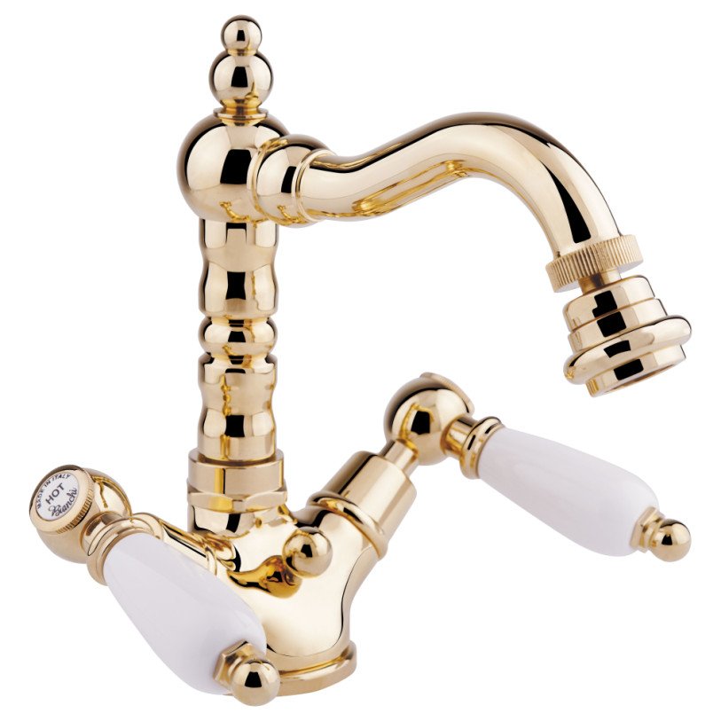 Змішувач для біде Bianchi First BIDFRS1037#026IAORO виконаний з білими вентильними ручками та глянцевою золотою поверхнею, яка виглядає багато та зробить інтер‘єр королівським. Підійде для ванни в стилі ретро, класика або чудово поєднається з ванними аксесуарами такої ж моделі, або такого ж кольору. Поверхня стійка до корозії та збереже свій блиск на довгі роки завдяки виготовленню з латуні, додаванню нікелю товщиною 11 мкм і порошкової фарби. Виріб монтується врізним способом на обідок біде.
