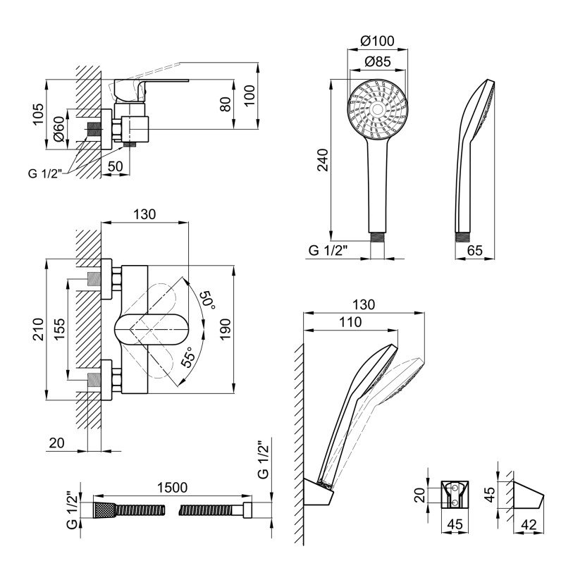 | Комплектація | Змішувач, кронштейн для ручного душу, лійка для ручного душу, душовий шланг, кріпильні деталі. |
