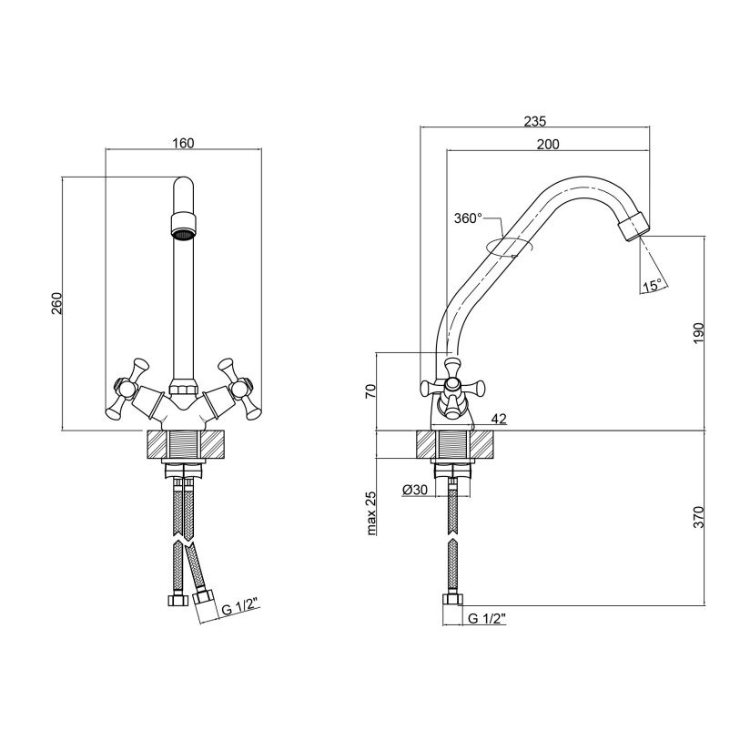 Змішувач для кухні Lidz (CRM) 75 21 272F-1 виготовлений з цинку. Завдяки глянсовому хромованому покриттю має оригінальний зовнішній вигляд. Виконаний в класичному стилі, з вентильними ручками для перемикання потоку холодної та гарячої води.
