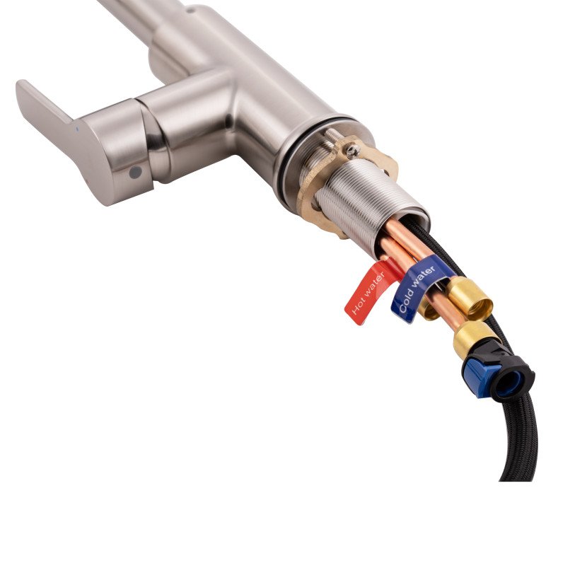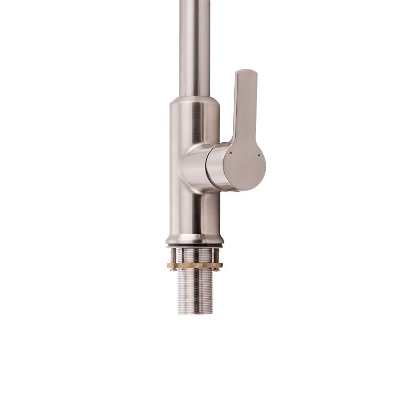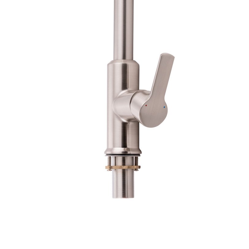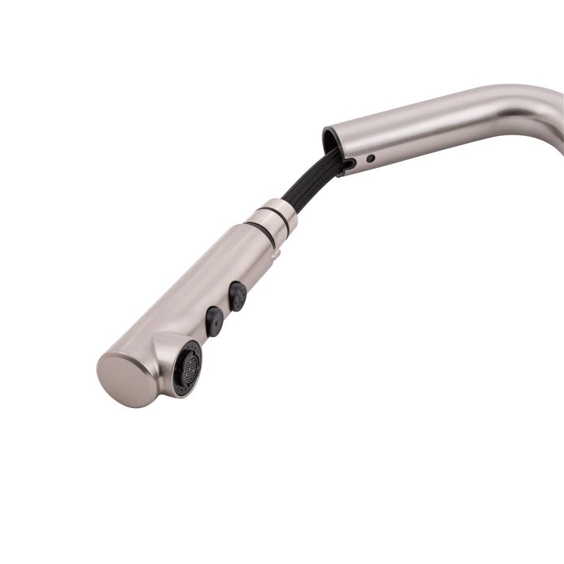 Змішувач для кухні з висувним виливом Qtap Janicka 9134103FN виготовлено з високоякісної нержавіючої сталі з брашованим нікельованим покриттям, що забезпечує довговічну безперебійну роботу виробу. Завдяки висувній формі виливу і двом режимам подачі струменя, які перемикаються кнопкою на виливі, можна з легкістю очистити важкодоступні місця на посуді. Довжина висувного шланга - 1470 мм. Управління температурою і напором води здійснюється за допомогою зручного важеля.