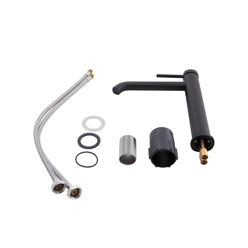 Змішувач для раковини Qtap Robin 1060H102B виконаний у сучасному стилі, виготовлений з високоякісної харчової латуні, яка не схильна до корозії, стійка до ударів та появи тріщин. Матове чорне покриття не тільки підвищує довговічність змішувача, але й надає оригінальному зовнішньому вигляду. Інтенсивність водного потоку та температура регулюються за допомогою переміщення важеля. Підключення води відбувається через гнучкі шланги з діаметром 1/2".