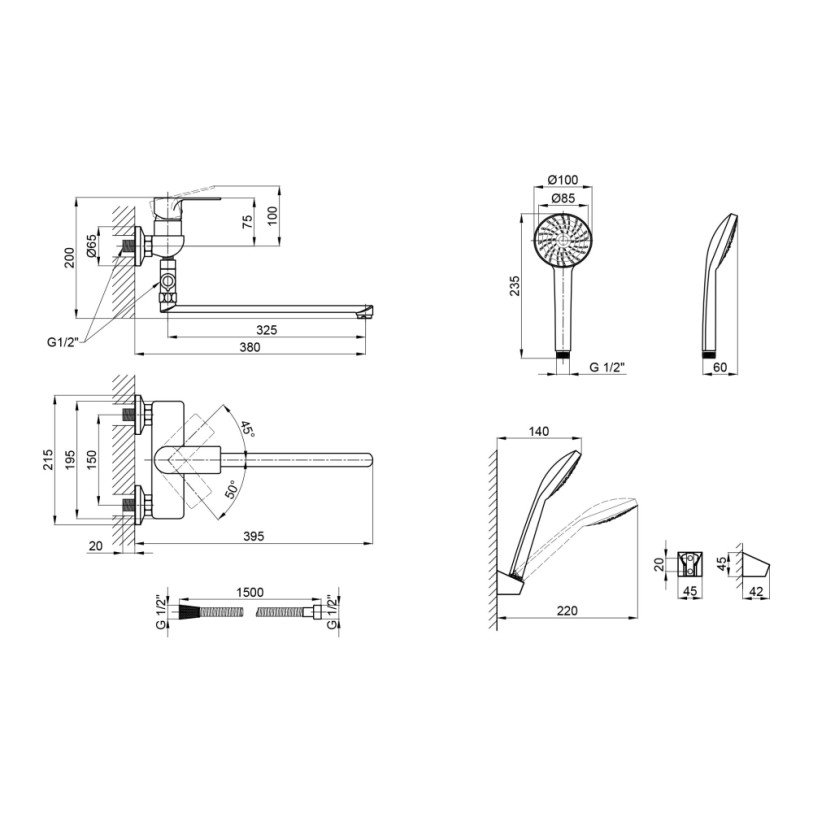 | Комплектація | Змішувач, лійка для ручного душу, душовий шланг, тримач для ручного душу, кріпильні деталі. |