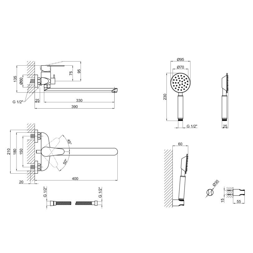 | Комплектація | Змішувач, лійка для ручного душу, душової шланг, кронштейн для ручного душу, кріпильні деталі. |