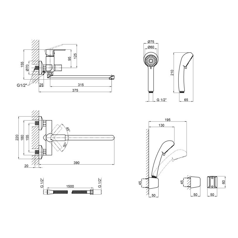 | Комплектація | Змішувач, лійка для ручного душу, душовий шланг, кронштейн, кріпильні деталі. |
