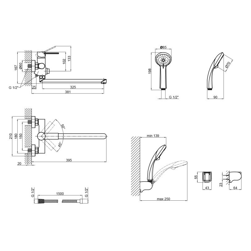 | Комплектація | Змішувач, лійка для ручного душу, душовий шланг, кронштейн для ручного душу, кріпильні деталі. |