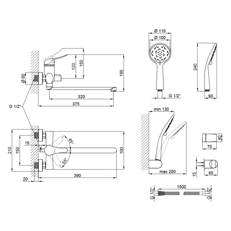| Комплектація | Змішувач, лійка для ручного душу, душовий шланг, кронштейн для ручного душу, кріпильні деталі. |