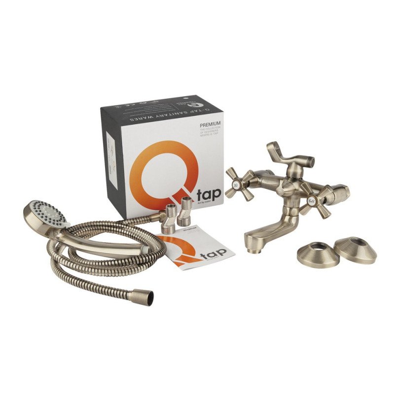 Змішувач для ванни Qtap Liberty ANT 140-2 з інтегрованим шланговим під‘єднанням виготовлений з міцної та зносостійкої латуні з рівномірним покриттям бронзового кольору, завдяки якому виріб має привабливий зовнішній вигляд й більш стійкий до механічних пошкоджень. У комплекті є лійка та душовий шланг. Подача води здійснюється за допомогою зручних вентилів з маркуванням холодної та гарячої води, а перемикання на душовий режим - поворотним дивертором.
